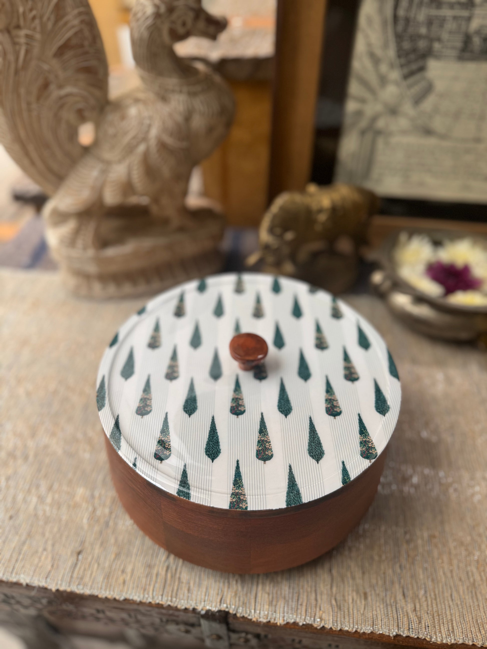 Handcrafted from rich mango wood, this roti box brings timeless charm to your dining table. The smooth wooden base pairs beautifully with a decorative lid featuring an elegant evergreen pattern — blending functionality with festive flair.